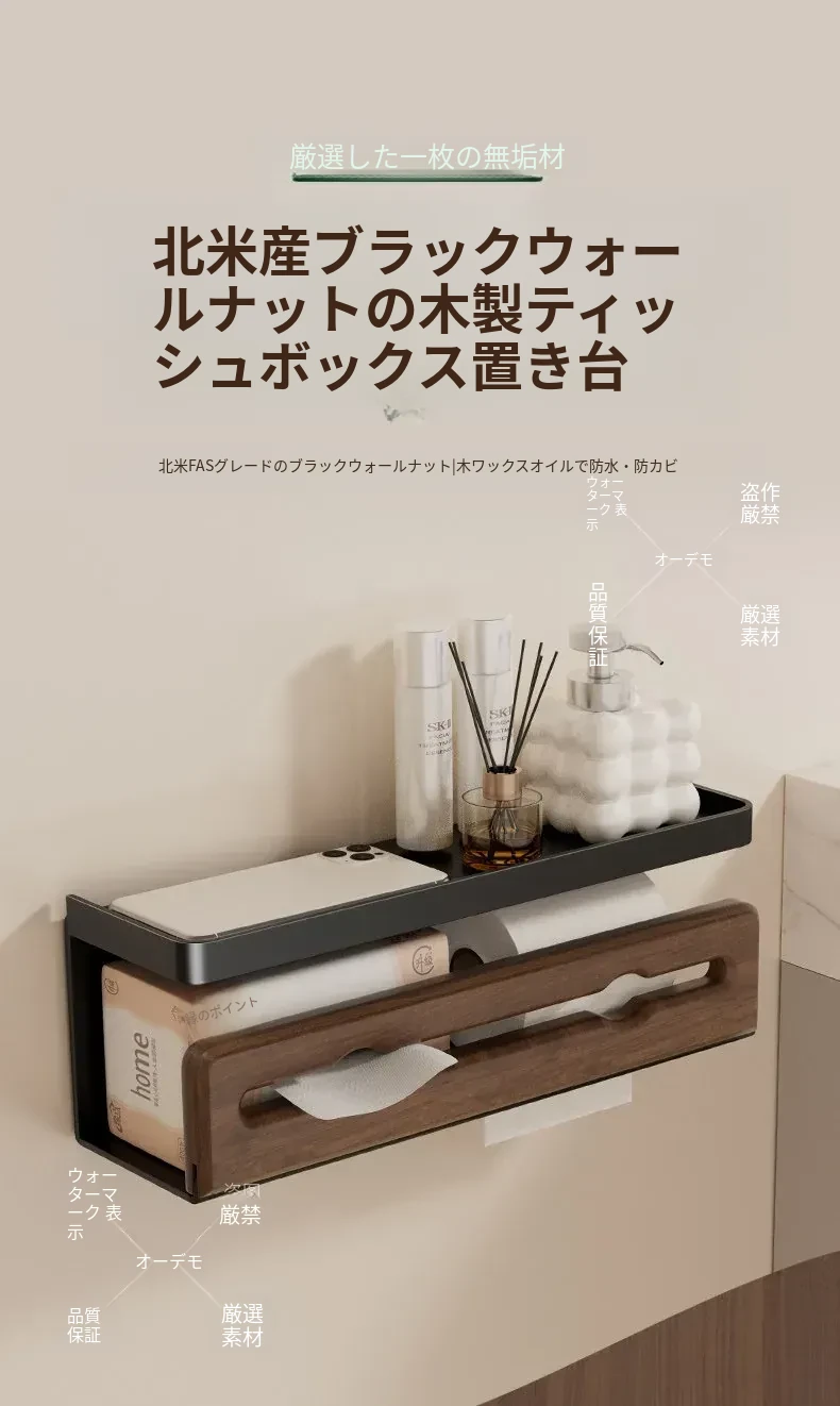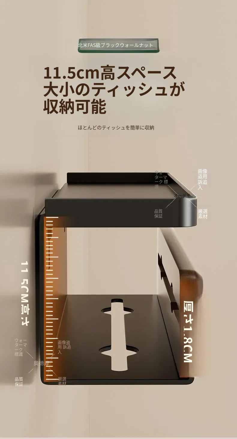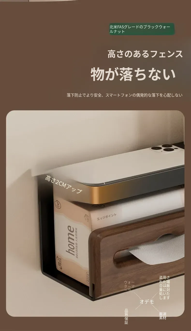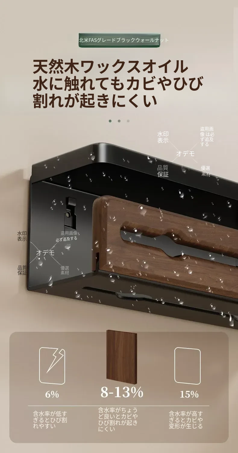 ウォールマウント式無孔ウッドティッシュボックス - おしゃれなクルミ材製、トイレや家庭で使える収納ラック。実用性とデザイン性を兼ね備えた、生活空間を格上げするアイテムです!