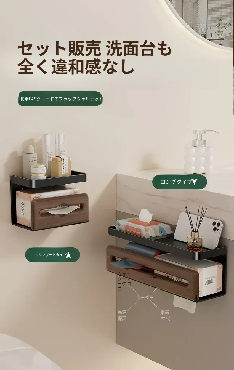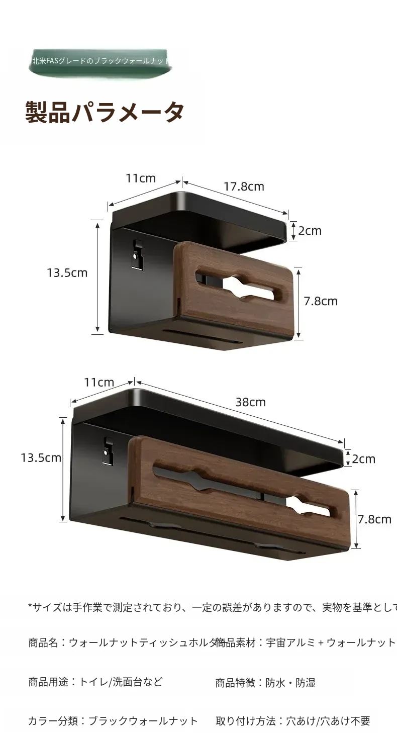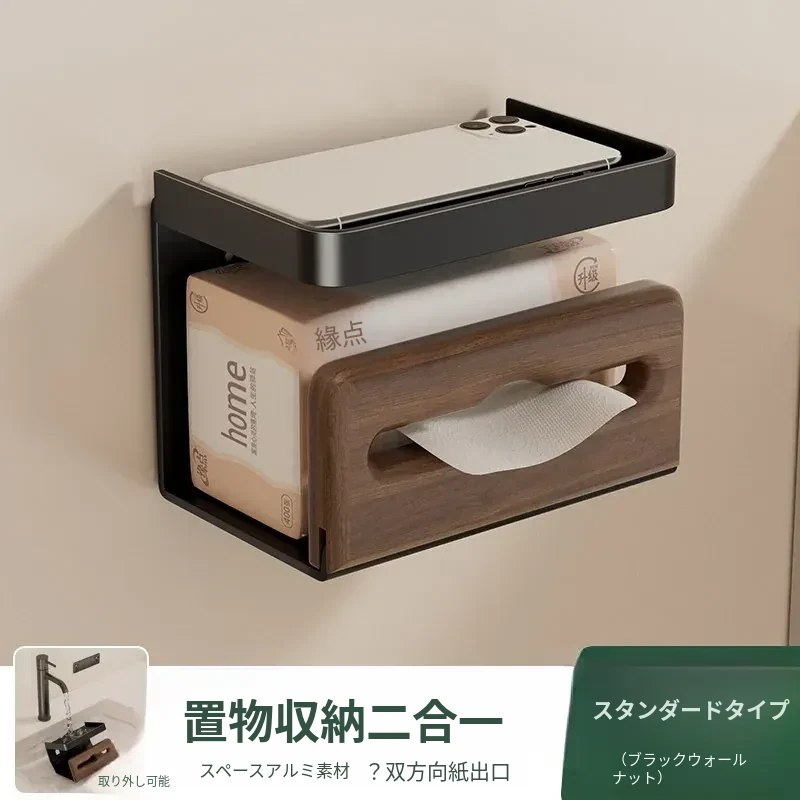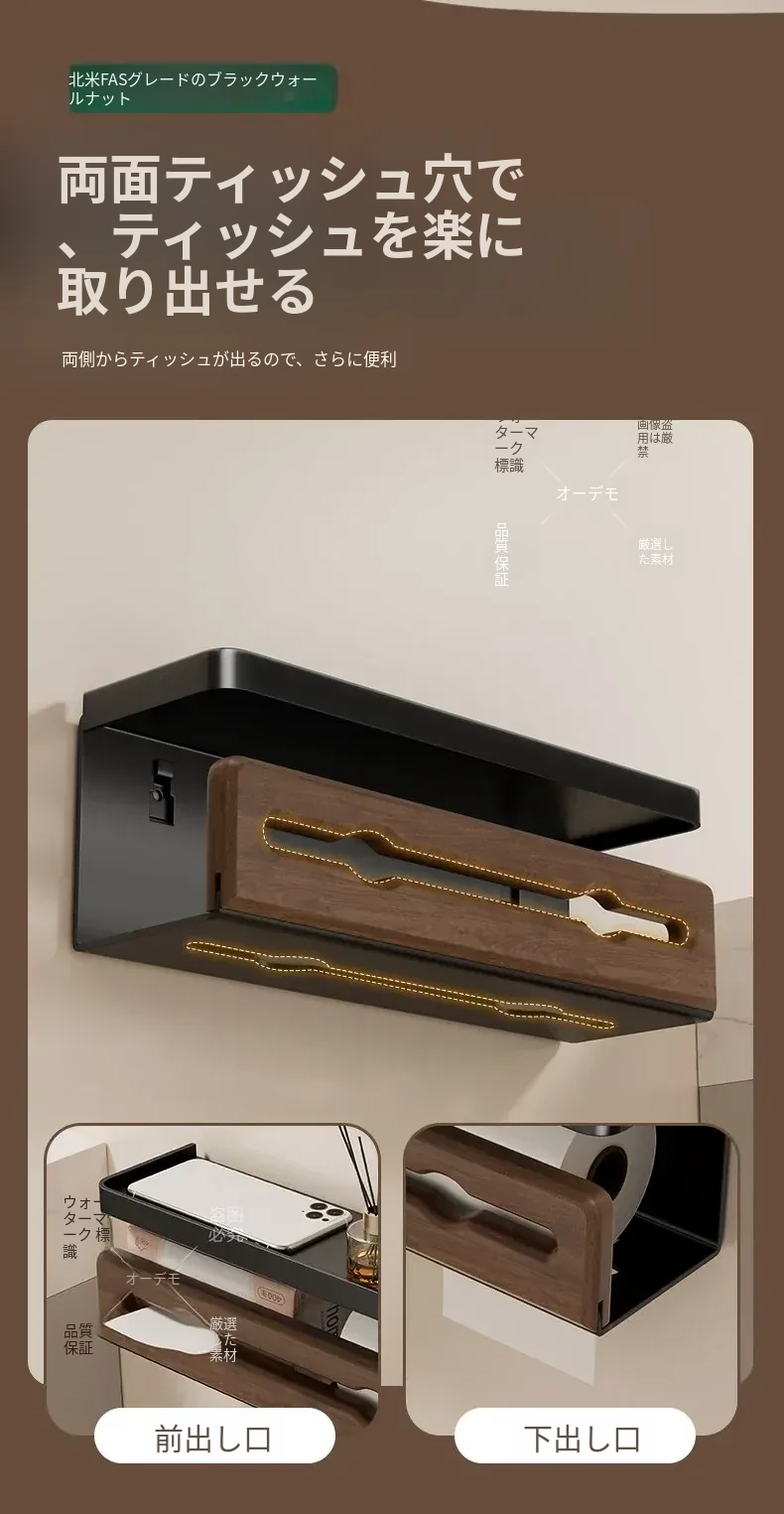 ウォールマウント式無孔ウッドティッシュボックス - おしゃれなクルミ材製、トイレや家庭で使える収納ラック。実用性とデザイン性を兼ね備えた、生活空間を格上げするアイテムです!